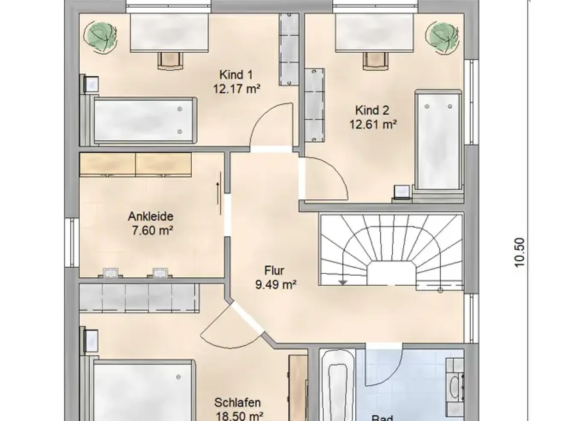 Im Obergeschoss befindet sich das Elternschlafzimmer mit Ankleide, zwei gleich große Kinderzimmer, und ein großzügiges Tageslichtbad welches keine Wünsche offen lässt.