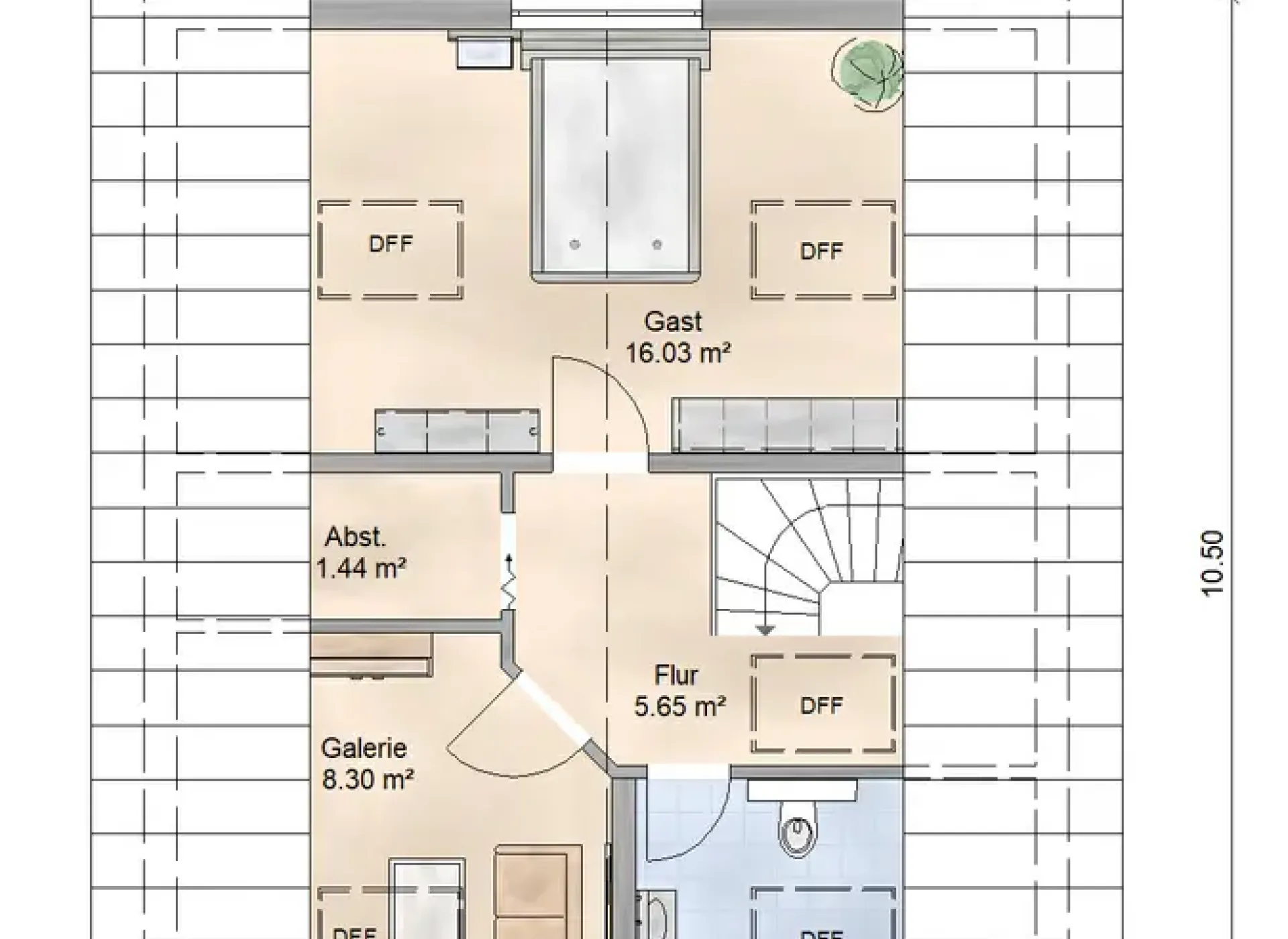 Im Dachgeschoss befinden sich ein Gästezimmer, ein Büro, ein Abstellraum und ein zusätzliches Duschbad. Denkbar wäre hier auch das Elternschlafzimmer mit Ankleide und eigenem Bad.