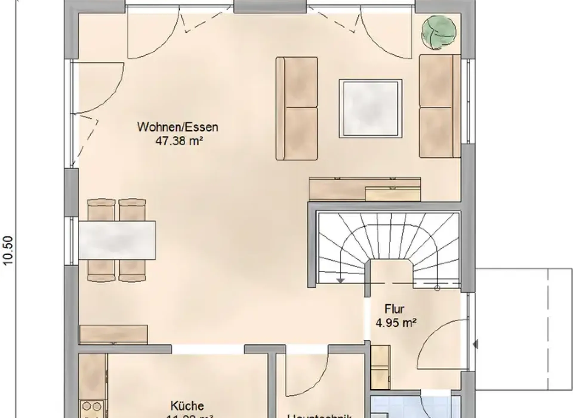 Das Erdgeschoss präsentiert sich mit einer geräumigen Diele, einem Gäste-WC, einem Haustechnikraum, einer großzügigen Küche und einem gigantischen und offen gehaltenem Wohn- Essbereich.