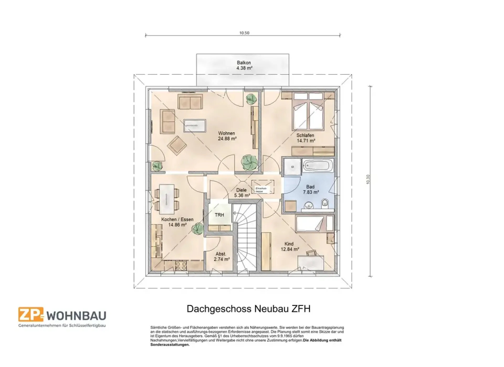 Ebenso entfaltet der durchdachte Grundriss in der Obergeschosswohnung mit Balkon sein volles Potential. Die zwei Elternschlafzimmer, das Kinderzimmer, der Abstellraum und das Bad bieten die gleichen Merkmale wie die Erdgeschosswohnung. Auch hier finden Sie den großzügigen Wohnbereich mit integrierter Küche und Essbereich. Abgerundet wird die Obergeschosswohnung mit einem nach süden und in Feldrandlage befindlichen Balkon. Auf dem großzügigen Balkon können Sie entspannt die Partenheimer Sommerabende genießen.